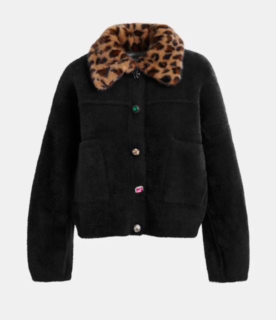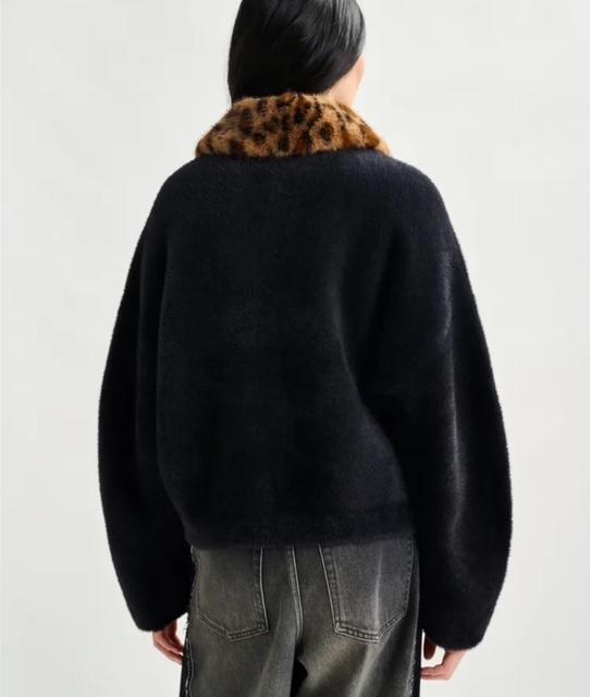 ESSENTIEL ANTWERP Cardigan noir avec col amovible en fausse fourrure léopard