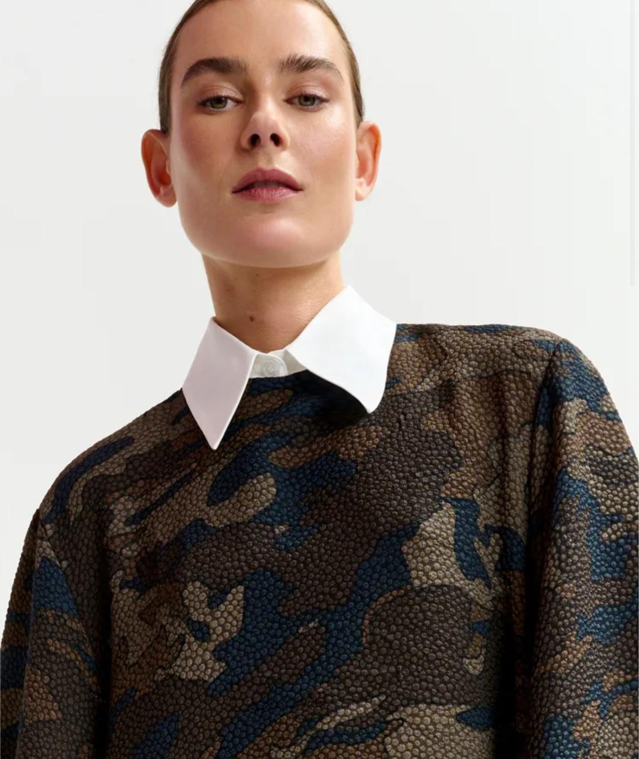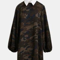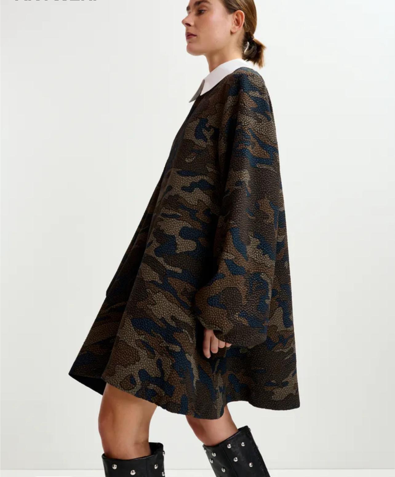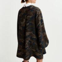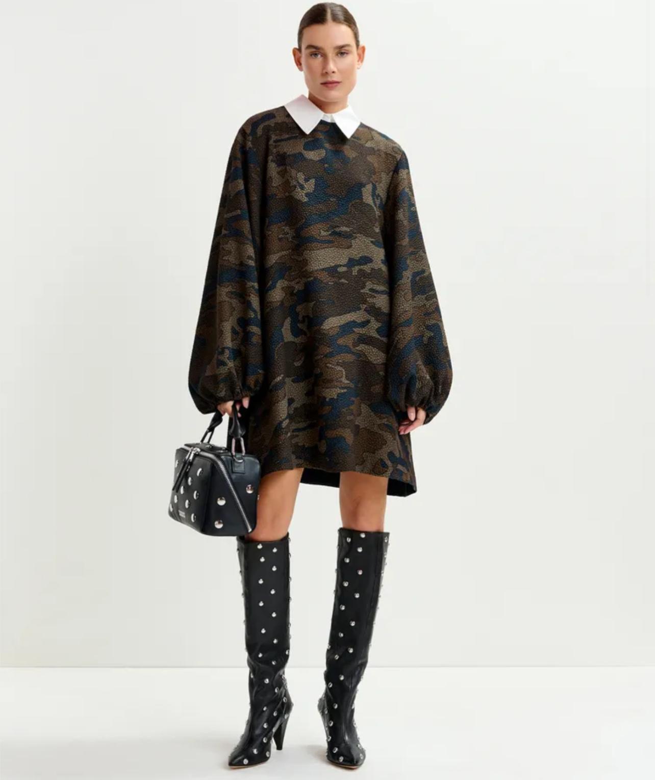 Mini-robe trapèze oversize, confectionnée à partir d’un mélange de polyester recyclé, dans une silhouette à emmanchure basse et manches larges. La fermeture à glissière dissimulée assure une finition lisse, tandis que le col blanc amovible ajoute une touche de polyvalence et de raffinement : parfait pour passer d’un look dynamique à un look raffiné. Avec son imprimé camouflage, ce haut allie structure et douceur avec une allure contemporaine.