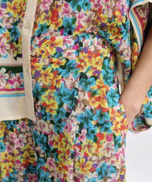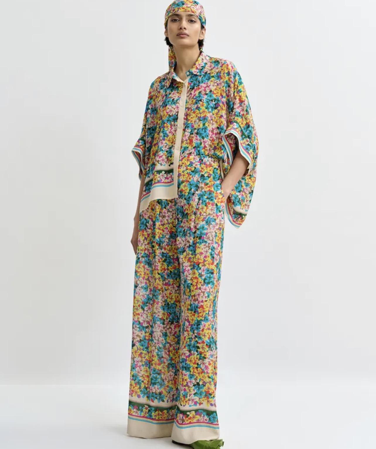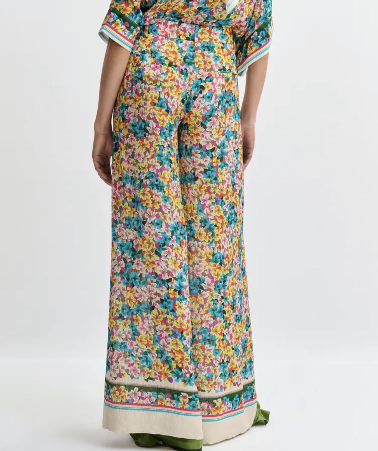 Réalisé en soie mélangée, ce pantalon à imprimé fleuri présente des coutures latérales incurvées soulignant les larges jambes fluides. Il est doté de deux poches passepoilées à l’arrière, de poches italiennes à l’avant, de passants de ceinture et d’une fermeture zip et bouton.