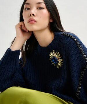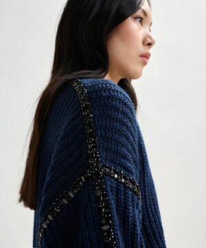 ESSENTIEL ANTWERP Pull en laine mélangée bleu marine avec col amovible et strass