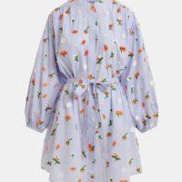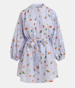 ESSENTIEL ANTWERP robe genou bleu clair à col mandarin et ornements verts et orange