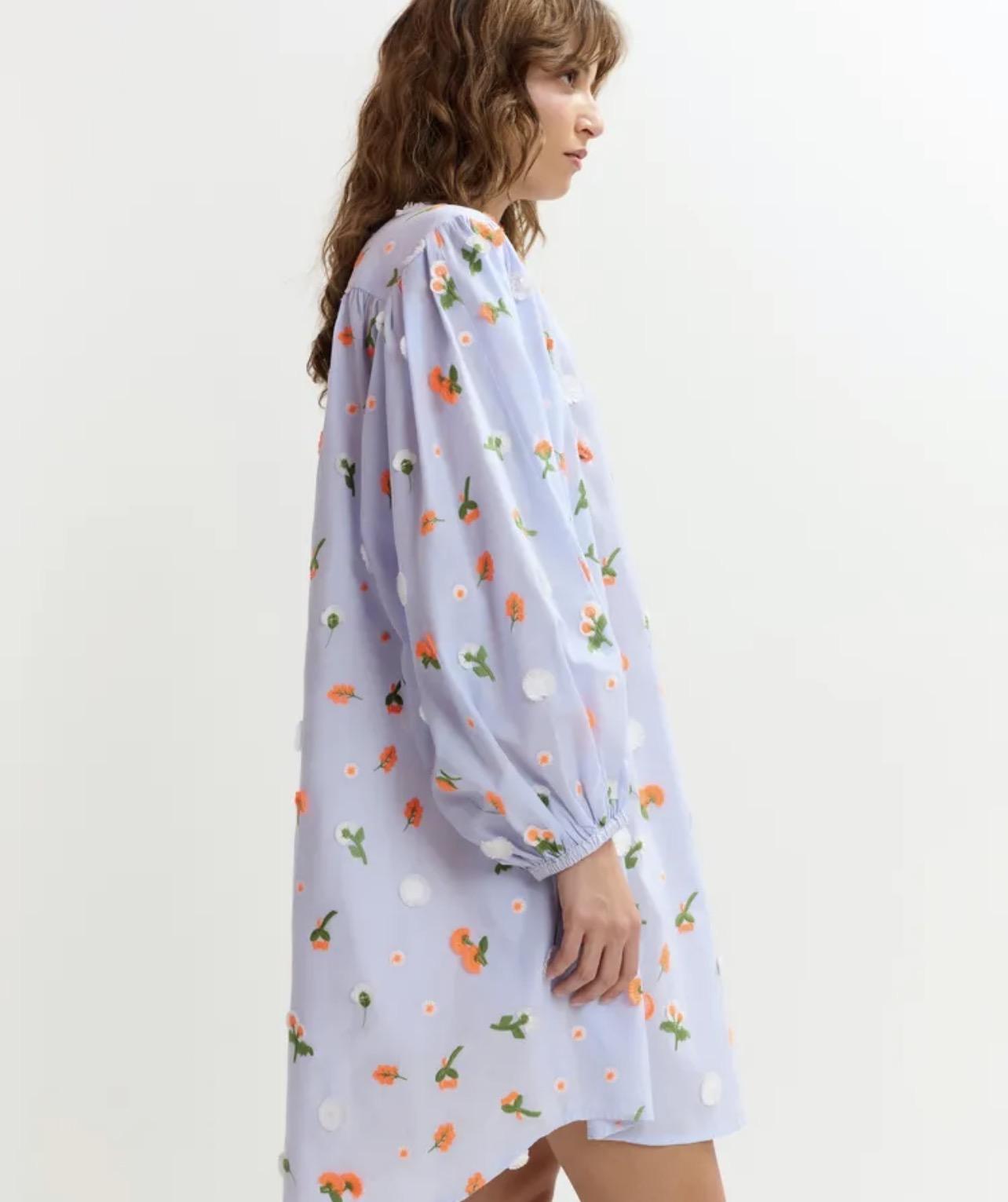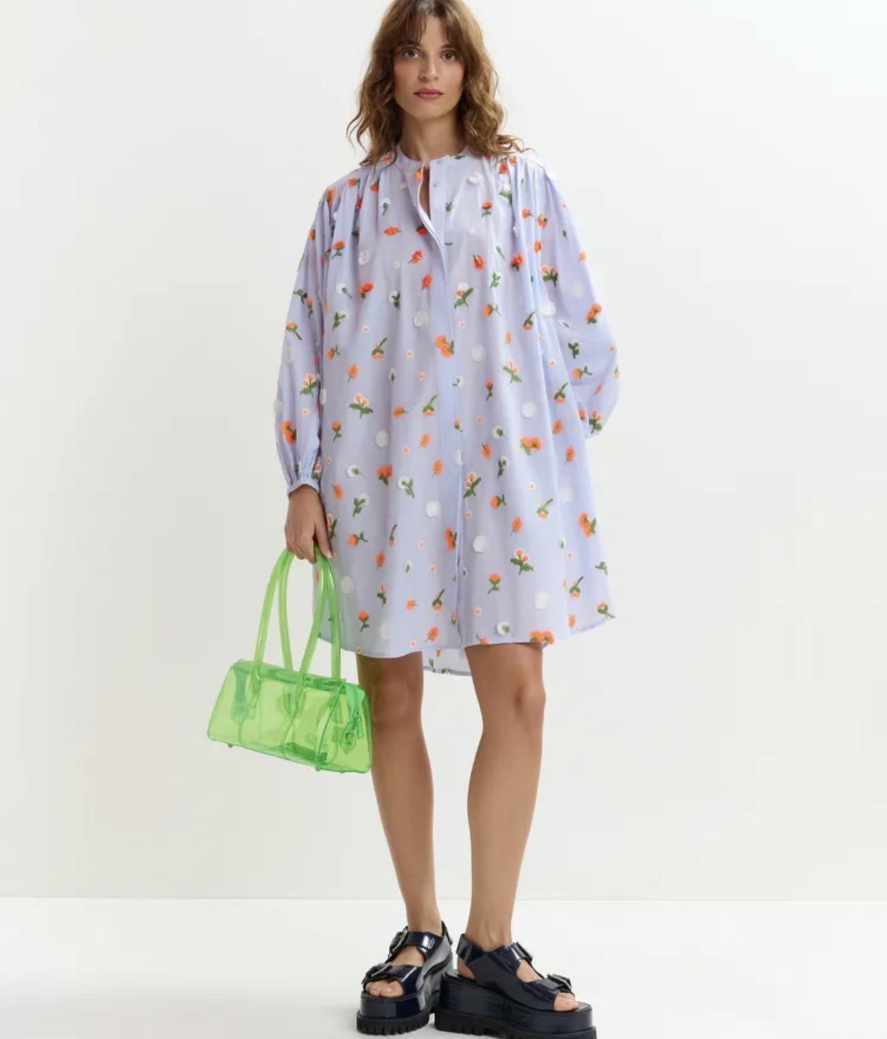 ESSENTIEL ANTWERP robe genou bleu clair à col mandarin et ornements verts et orange