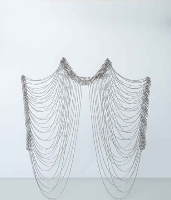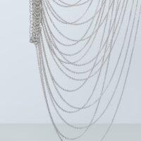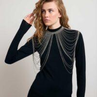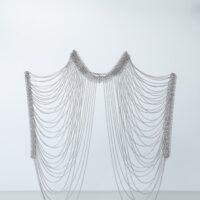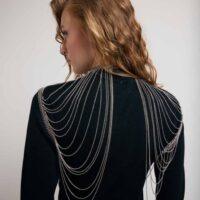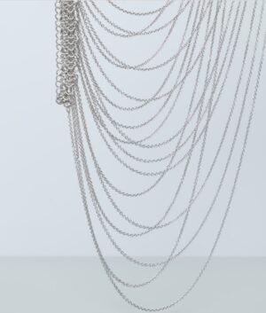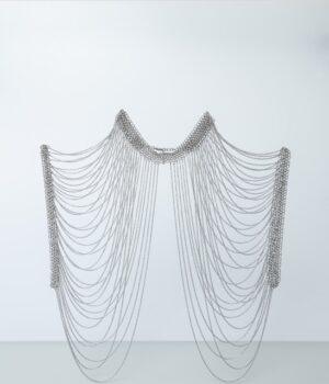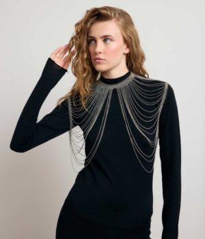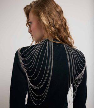 Le collier ON TOP est LA pièce originale de notre collection ! Ce bijou de corps se porte en superposition de nos vêtements, en l’enfilant comme un top. Sa base prend la forme d’un collier avec des maillons assez épais et se ferme à l’aide d’un fermoir. Il se prolonge par une multitude de chaînettes qui ornent le buste. Parfait pour accompagner un modèle bustier, il peut aussi être porté sur une robe à manches longues. Fabriqué artisanalement, chaque anneau est assemblé à la main.