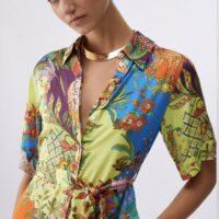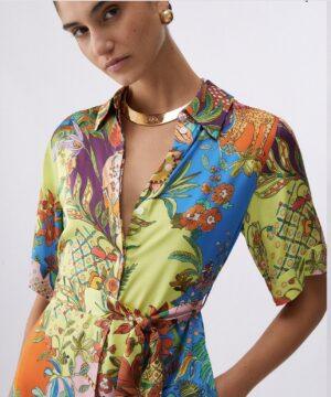 Le satin offre un effet lumineux et sophistiqué, tandis que l’imprimé patchwork floral est mis en avant. Cette robe est votre passe-partout glamour, idéale avec des sandales minimalistes ou des bottines pour un look contemporain.