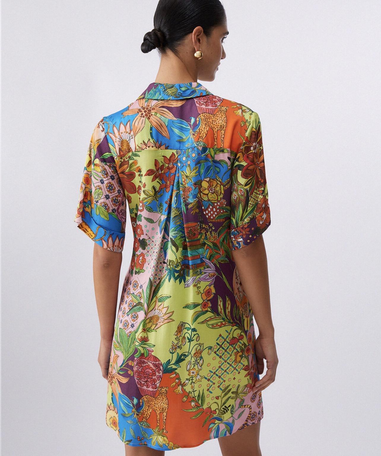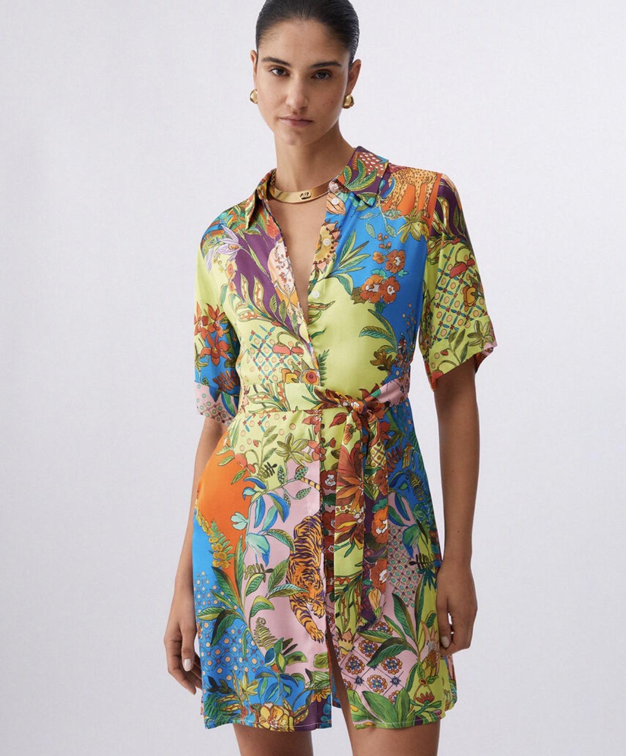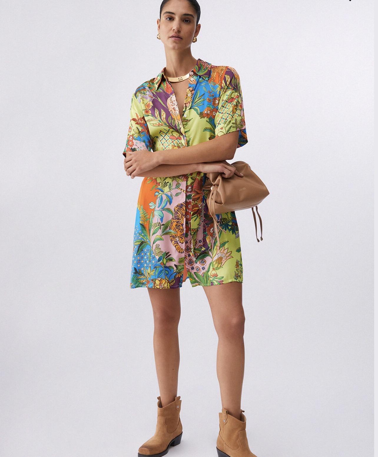 Le satin offre un effet lumineux et sophistiqué, tandis que l’imprimé patchwork floral est mis en avant. Cette robe est votre passe-partout glamour, idéale avec des sandales minimalistes ou des bottines pour un look contemporain.