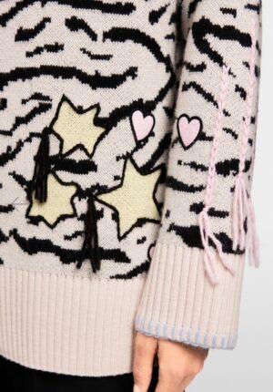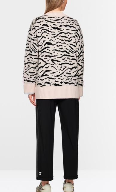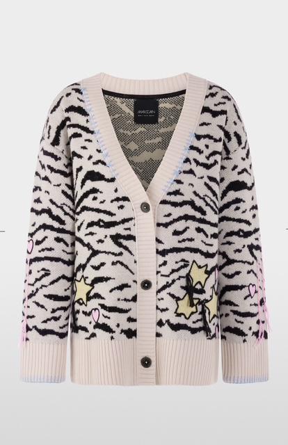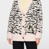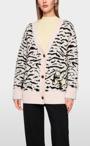 Ce cardigan séduit par sa coupe ample et longue et ses épaules tombantes. Son imprimé animalier avec ses applications et ses détails tricotés attire tous les regards. Ce cardigan est confectionné en 100 % pure laine, ce qui lui confère une grande qualité et un confort optimal au contact de la peau. Il se ferme à l’aide de trois boutons.