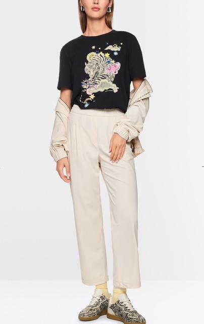 • T-shirt en pur coton. Ce t-shirt présente une coupe droite et un col rond. Il se distingue par son imprimé sur le devant représentant un tigre et de nombreuses applications différentes. Le motif est rehaussé de paillettes, de broderies et de perles. Parfait pour compléter un blazer ou à porter seul.