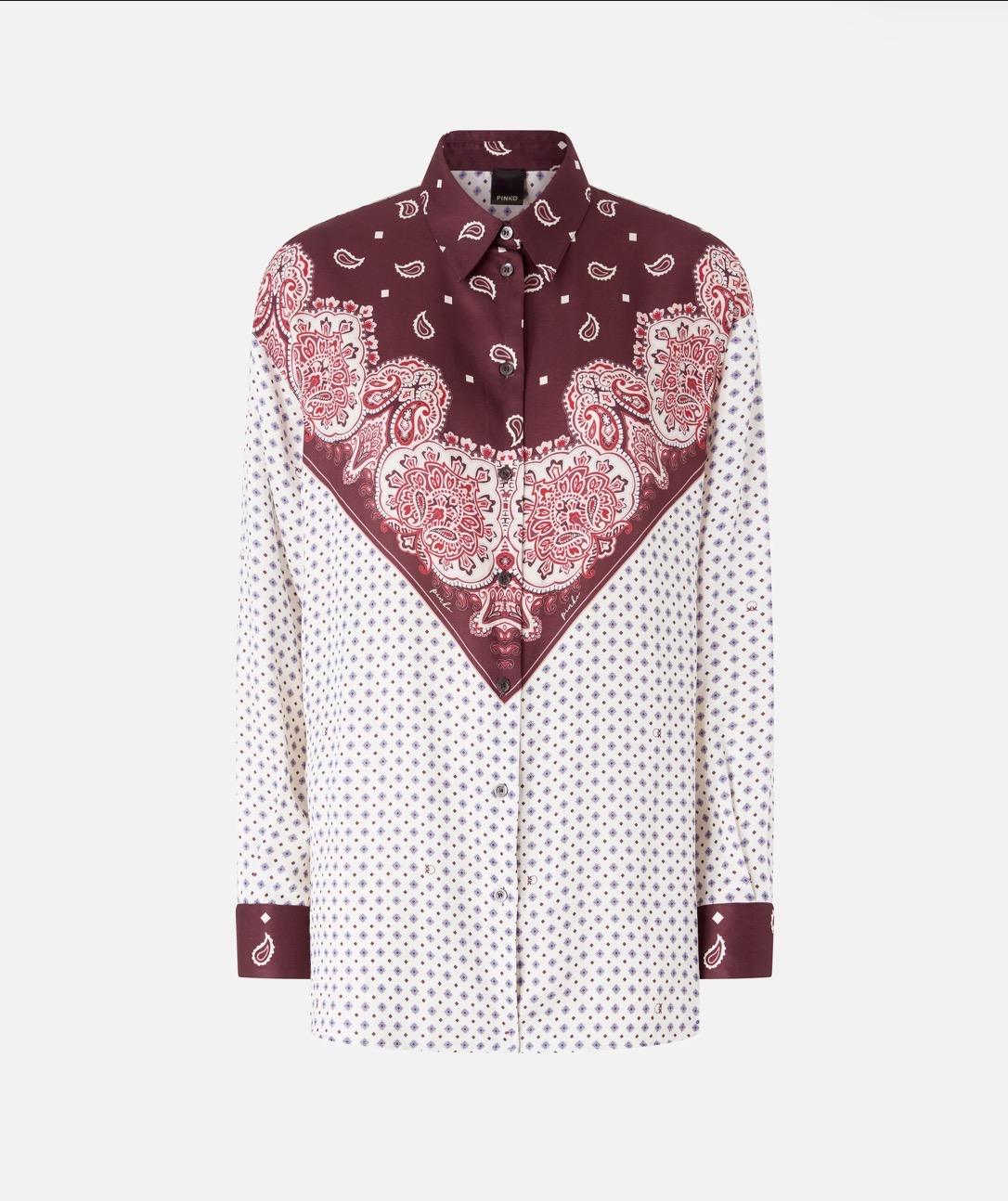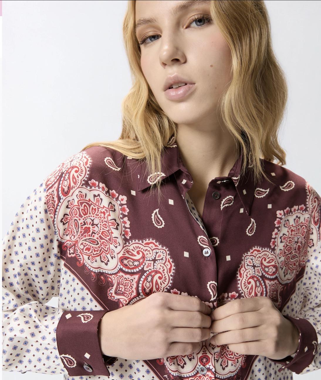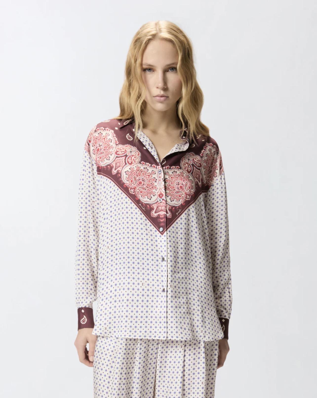 Chemise longue et fluide en twill de viscose à col classique, poignets boutonnés, patte de boutonnage sur le devant et empiècement dos à pli rond. Modèle rehaussé d’un imprimé façon foulard à motif cravate all-over et d’un imprimé placé contrastant, retombant comme un bandana sur le devant et repris au niveau des poignets et du col. Pour un total look réussi, portez cette chemise avec le pantalon assorti, orné du même motif