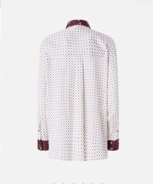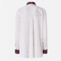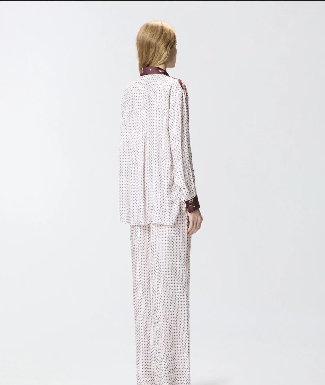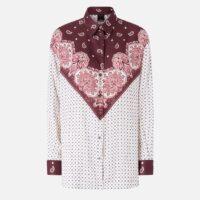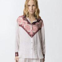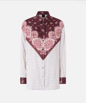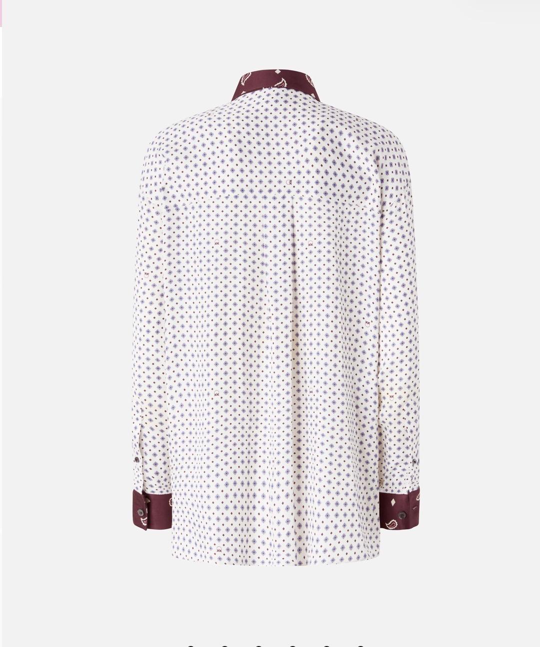 Chemise longue et fluide en twill de viscose à col classique, poignets boutonnés, patte de boutonnage sur le devant et empiècement dos à pli rond. Modèle rehaussé d’un imprimé façon foulard à motif cravate all-over et d’un imprimé placé contrastant, retombant comme un bandana sur le devant et repris au niveau des poignets et du col. Pour un total look réussi, portez cette chemise avec le pantalon assorti, orné du même motif
