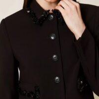 • Blouson court en crêpe de viscose mélangée avec col et poches rehaussées d’une passementerie de sequins. Il présente des manches longues dotées de boutons dans le bas, une fermeture boutonnée ton sur ton, des poches à rabat, une doublure, une étiquette siglée Oval T dans le dos et une coupe slim.