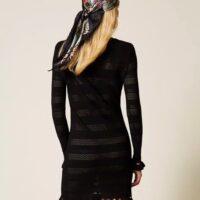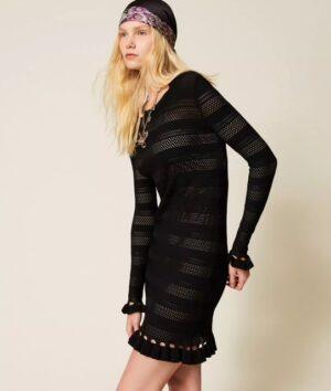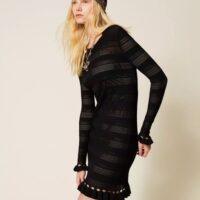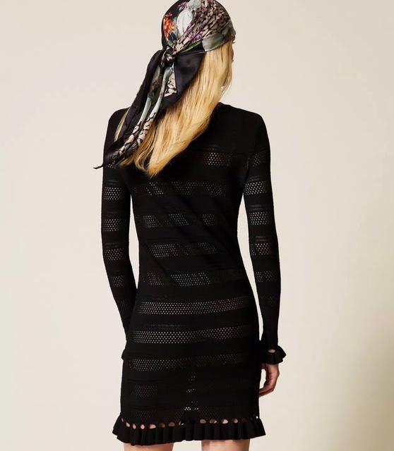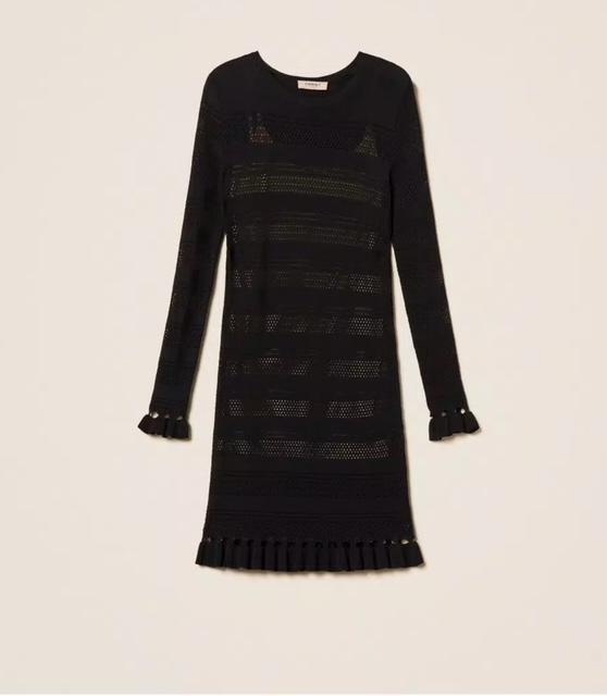 Robe courte en crêpe de viscose avec finition en point jersey qui alterne avec des ajours et un point filet pour créer des rayures horizontales. Elle présente un col rond, des manches longues, un bas rehaussé de petits volants, un fond de robe assorti et une coupe ajustée.