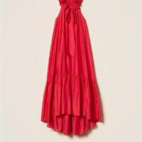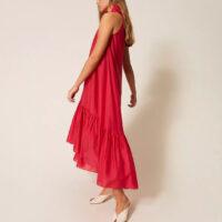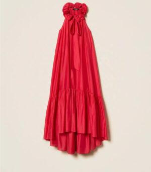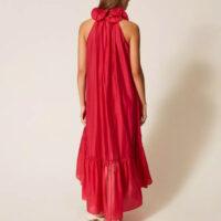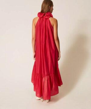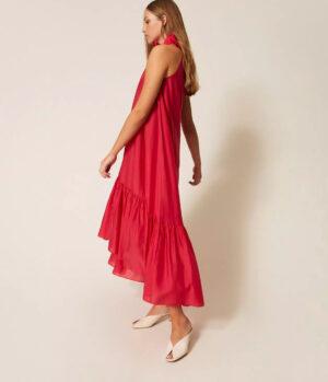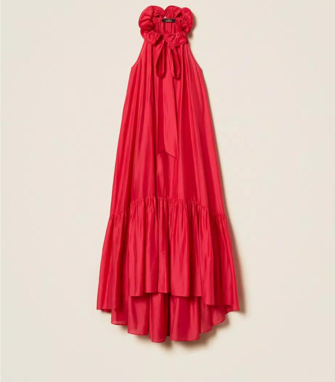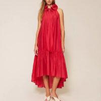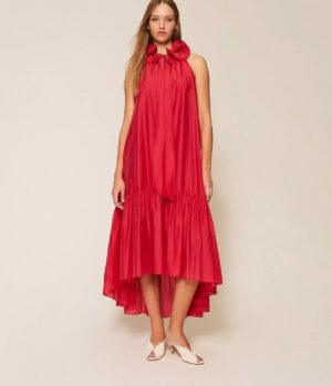 - Robe longue de la collection Actitude en voile avec col rehaussé d’un volant ondulé grâce à l’insertion d’un fil métallique qui maintient la forme. Elle présente une ouverture en goutte boutonnée sur le devant, un col lavallière à nouer, un volant froncé dans le bas pour créer de l’ampleur, une doublure et une coupe ample.